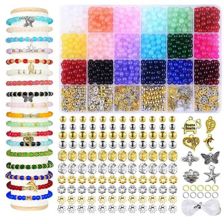 The 1280PCS 6mm Glass Beads Bracelet Making Kit includes 24 styles of sparkling crystal beads, perfect for crafting elegant bracelets, necklaces, and other jewelry. Each round bead is made from high-quality glass with a smooth finish and brilliant shine, giving every creation a professional look. The set also comes with spacer beads and charms, allowing for endless design combinations. Ideal for jewelry makers and DIY enthusiasts, this kit offers everything needed to create stylish, personalized accessories with ease